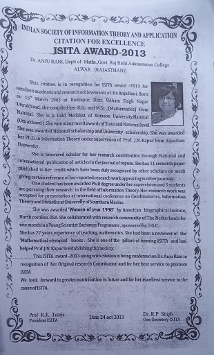 The Seventh award was given to Dr. R.P. Singh, Sahibabad for his research contribution in measures of information, Functional Equations Questionnaire theory, Statistics mixture distribution theory and fuzzy measures of information.